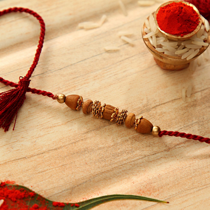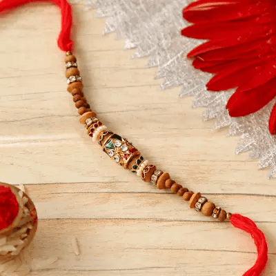 At Mayur Rakhi, we take pride in presenting the Chandan Rakhi, a true embodiment of craftsmanship and sentiment. Our team of skilled artisans delicately handcrafts each rakhi, adorning it with genuine sandalwood beads that exude a natural and captivating aroma. The Chandan Rakhi beautifully captures the essence of tradition while offering a contemporary touch, making it a timeless token of affection for your brother.